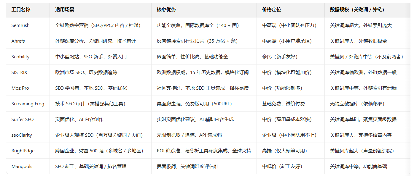 优势:关键词难度评分与 SERP 分析可靠性高;Link Explorer 工具提供全面的外链信息,通过简化分数即可评估链接质量,且索引规模已达行业前列;社区支持与客户服务完善,对 SEO 学习者帮助较大;集成本地 SEO 工具,可管理商业列表,兼顾全局与本地 SEO 需求。